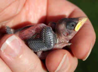 Young nestlings have areas of bald skin and cannot regulate their own body temperature when out of their nest. They die very quickly unless rescued. Pick them up before something eats them and keep them warm in your hand or on a covered hot water bottle, then Contact Us immediately. Waiting half an hour could mean the difference between life and death for the bird. Do not try to give them any food or water, it could kill them.